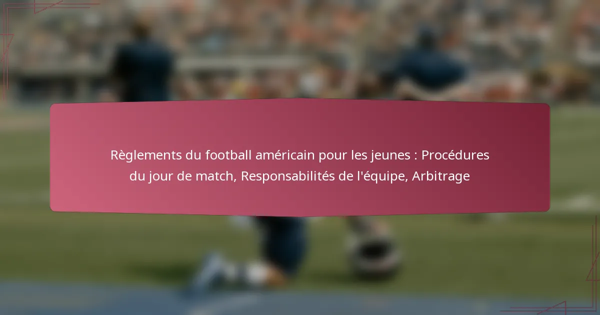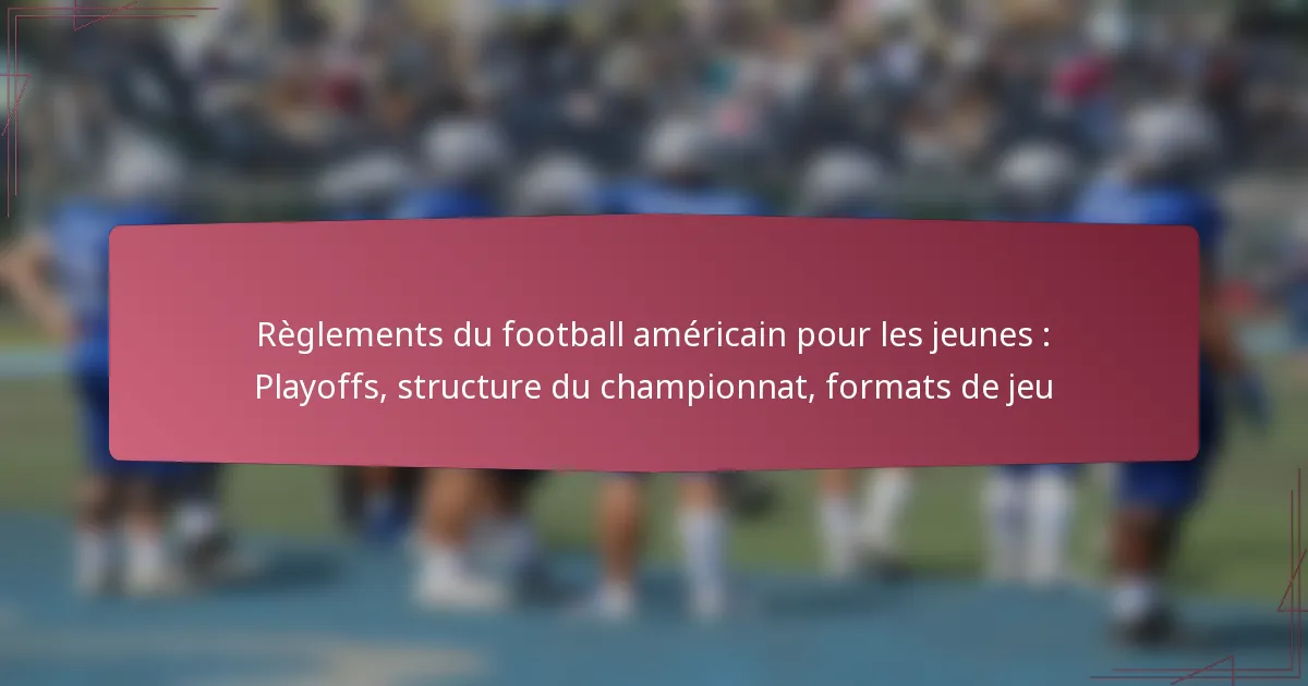 Les règlements du football américain pour les jeunes établissent des directives essentielles concernant la composition des équipes, la durée des matchs et le système de points, garantissant un environnement sûr et équitable pour les jeunes athlètes. Les règles d’équipe varient selon les groupes d’âge et les ligues, tandis que les matchs durent généralement entre une et deux heures, structurés autour de quarts ou de mi-temps. Le score est basé sur des jeux spécifiques, avec des valeurs de points désignées pour les touchdowns et les field goals, ce qui rend important pour tous les participants de comprendre ces dynamiques pour un jeu efficace.