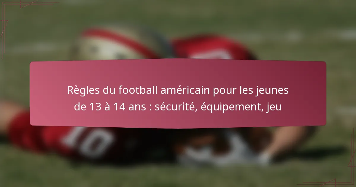 Le football américain pour les jeunes de 13 à 14 ans met l’accent sur la sécurité, l’équipement approprié et un jeu structuré pour créer un environnement sécurisé et compétitif. Les règles de sécurité clés incluent la gestion des commotions cérébrales et l’équipement de protection obligatoire, tandis que l’équipement essentiel se compose de casques, de protections d’épaules et de protège-dents. Les règles de jeu sont conçues pour promouvoir le fair-play et le développement des compétences, garantissant une expérience agréable pour les jeunes athlètes.
