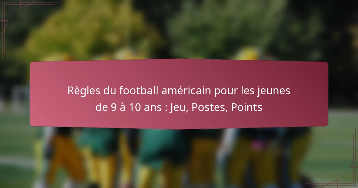 Le football américain pour les jeunes de 9 à 10 ans met l’accent sur une expérience de jeu sûre et agréable tout en introduisant les fondamentaux du sport. Les règles définissent la durée du jeu, le nombre de joueurs et les dimensions du terrain, garantissant que les jeunes athlètes apprennent le jeu dans un environnement de soutien. Les joueurs peuvent explorer diverses positions en attaque et en défense, chacune contribuant au succès de l’équipe, tandis que comprendre les méthodes de marquage comme les touchdowns et les field goals est crucial pour une stratégie efficace pendant les matchs.